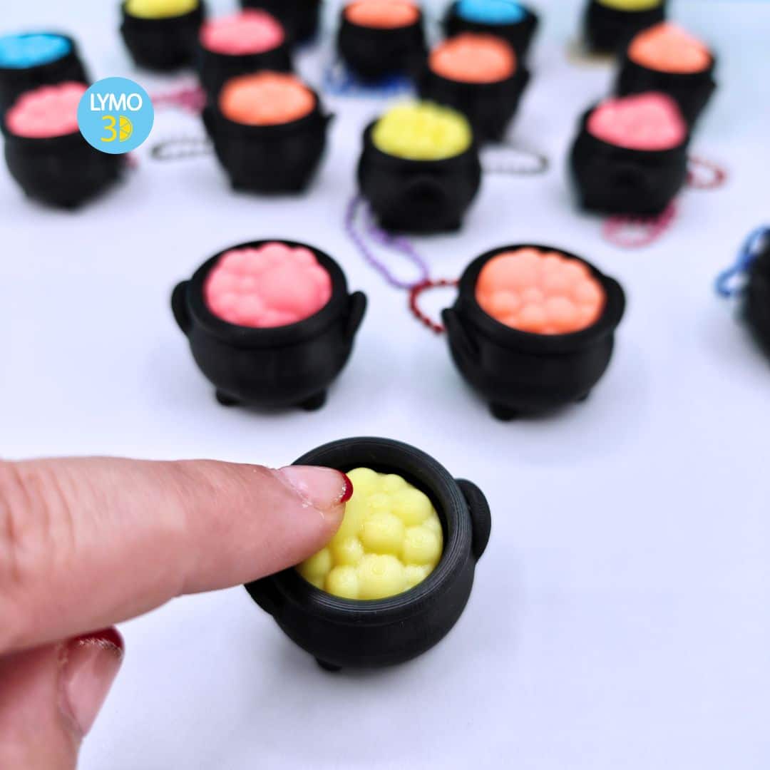 El proceso de creación en impresión 3D nos permite trabajar con precisión y asegurar que cada detalle del Llavero clicker caldero mágico esté bien definido. Desde las pequeñas patitas del caldero hasta la textura suave de las burbujas, todo está fabricado para resistir el uso diario sin perder calidad. No utilizamos pinturas, por lo que los colores forman parte del propio material, manteniendo así un acabado limpio y duradero. Además, su peso ligero te permite llevarlo cómodamente sin añadir volumen extra a tus objetos personales.