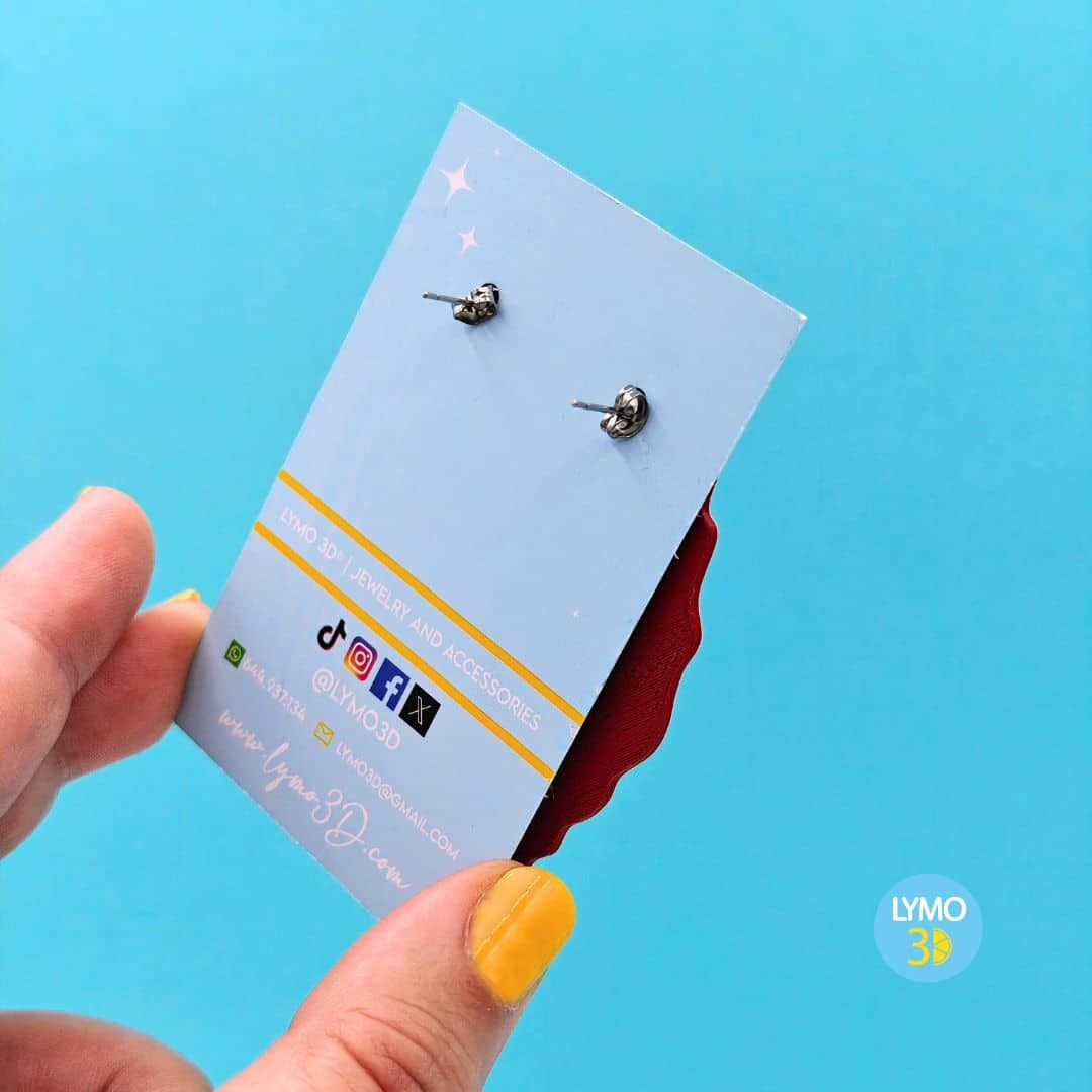 La montura de estos pendientes es de perno de acero, un material duradero y seguro que asegura un ajuste firme y cómodo. El acabado metálico del perno complementa los tonos del diseño principal, aportando un detalle de brillo sutil que realza la forma y los colores de la pieza. La unión entre tecnología y artesanía se refleja en cada detalle: desde la precisión del corte 3D hasta el ensamblado manual que da vida a cada par.