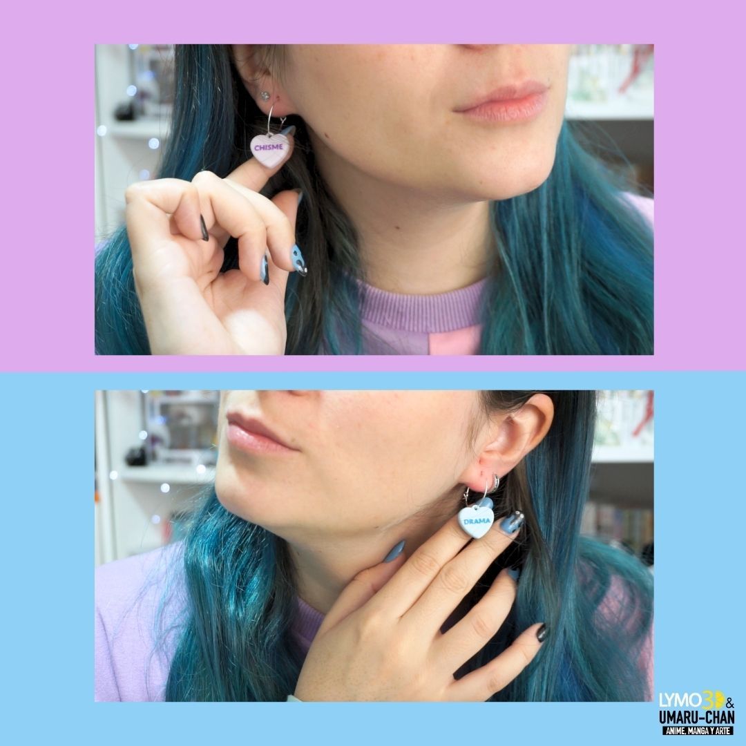 ¡No podían faltar en la colaboración con Umaru estos pendientes de Chisme y Drama!Son ideales para cualquier ocasión. Los colores de los corazones son morado pastel y azul pastel con las palabras escritas Chisme en morado y Drama en azul.
