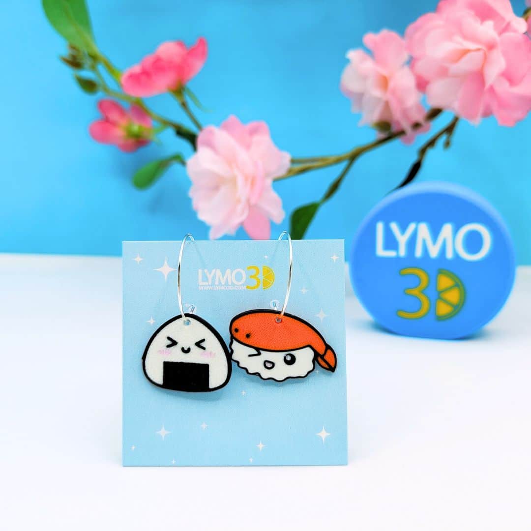 Pendientes Sushi time con aro de acero de 20 mm, ligeros y cómodos, impresos en 3D con PLA compostable. Diseño original que combina nigiri y onigiri para amantes del sushi y la moda sostenible.