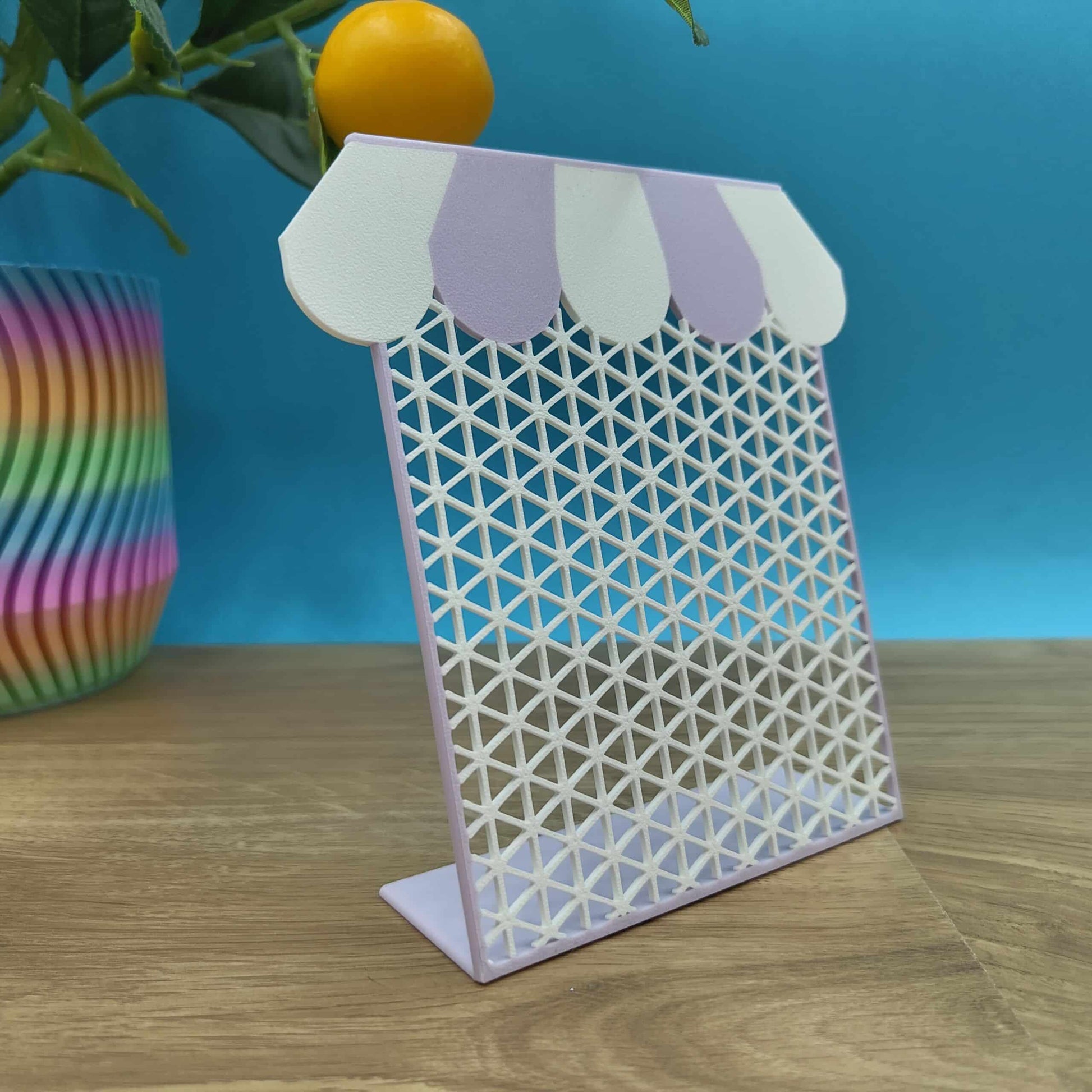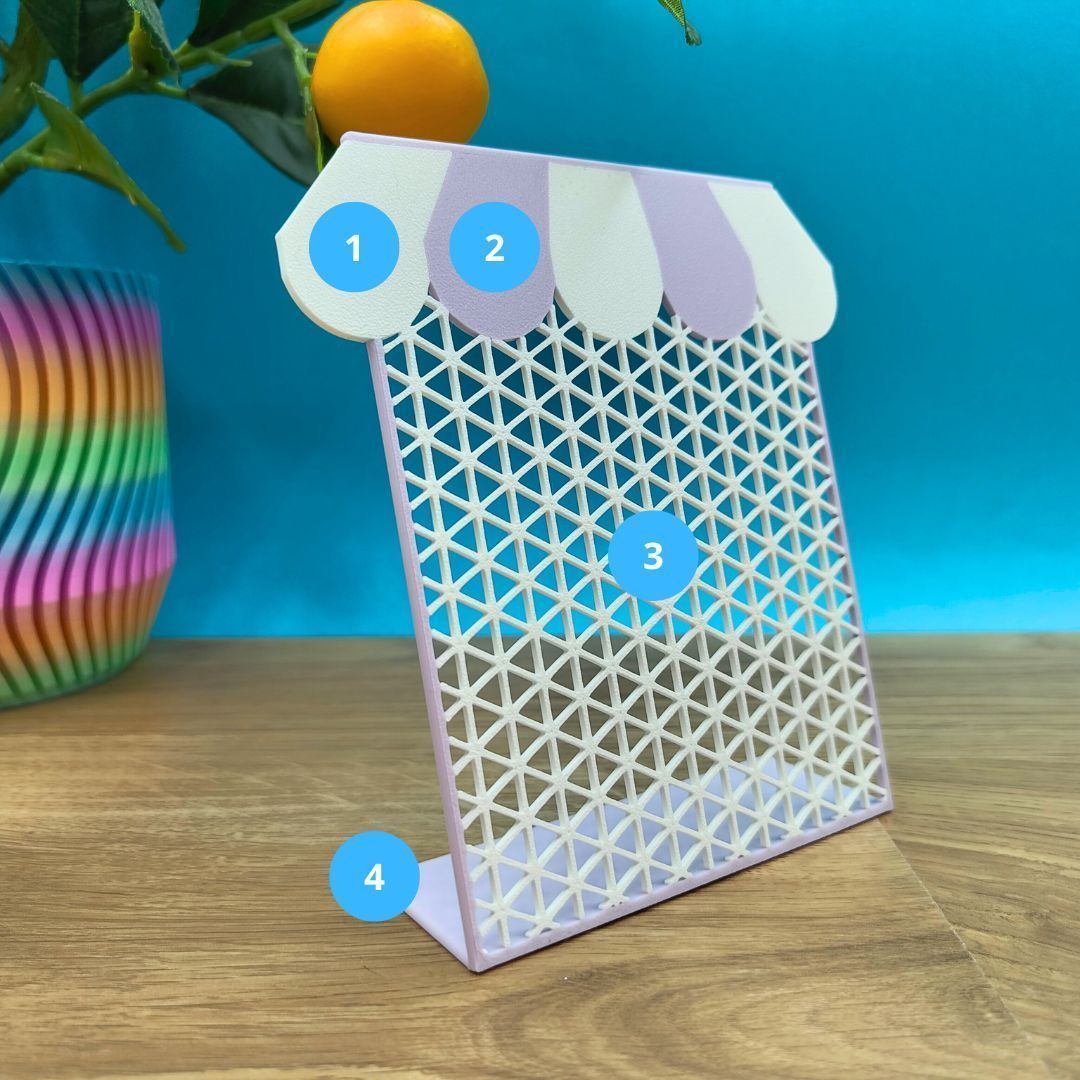 Transforma tu espacio con nuestro Soporte con Toldo, una solución práctica y decorativa para organizar tus pendientes, pines o accesorios pequeños. Diseñado y fabricado en nuestro taller mediante impresión 3D, este expositor combina funcionalidad, estética y personalización.
